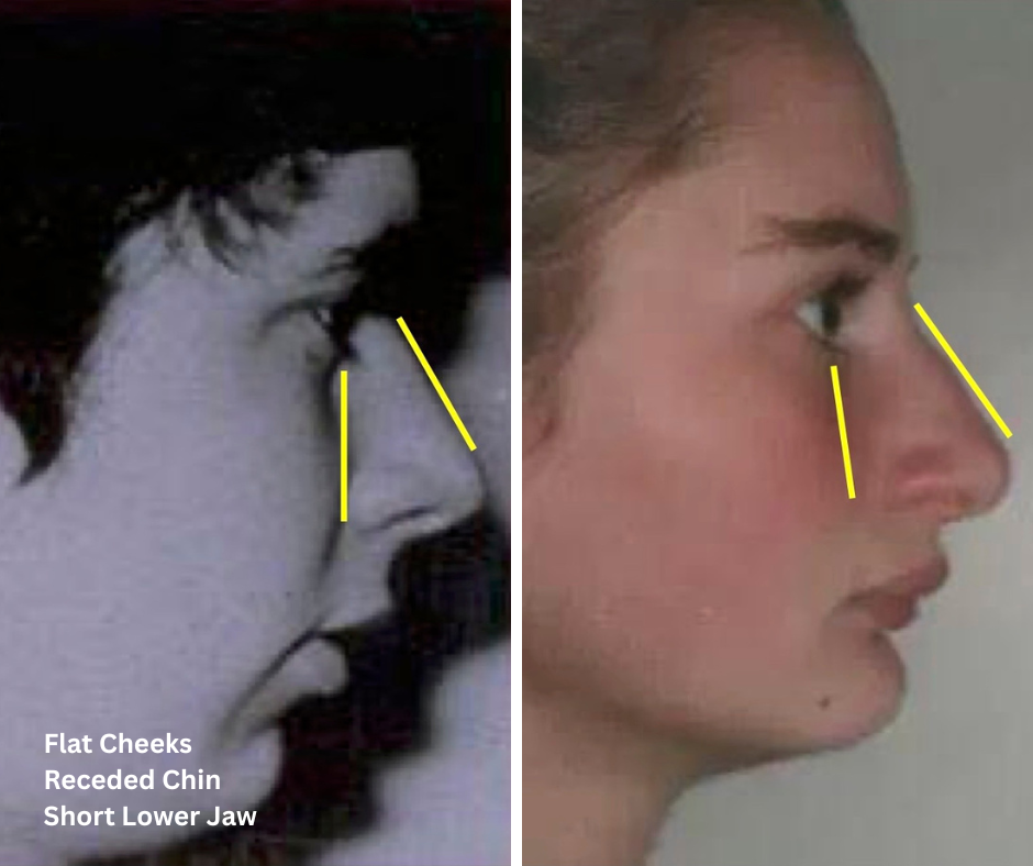 Flat cheeks or receded chin: indicate underdeveloped jaw and limited airway space